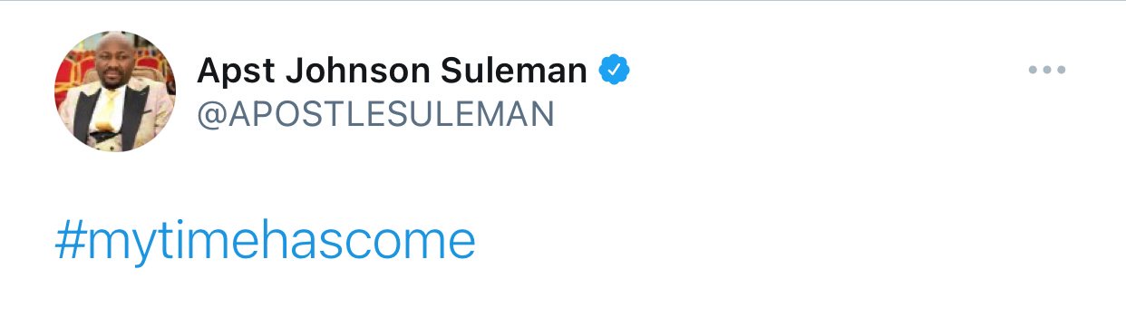 Apostle Johnson Suleman has taken to his Twitter page to tweet about his time. He tweeted, “My time has come”. His tweet has caused a stir and has attracted several different reactions from his online followers.